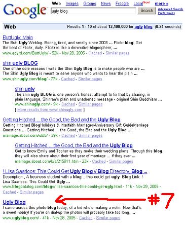 #1) Google placement for the keyword ugly blog (no quotes). Before running the system, I was ranked #8 in the search results. Today I am ranked #7. Not a big improvement, but an improvement nevertheless.